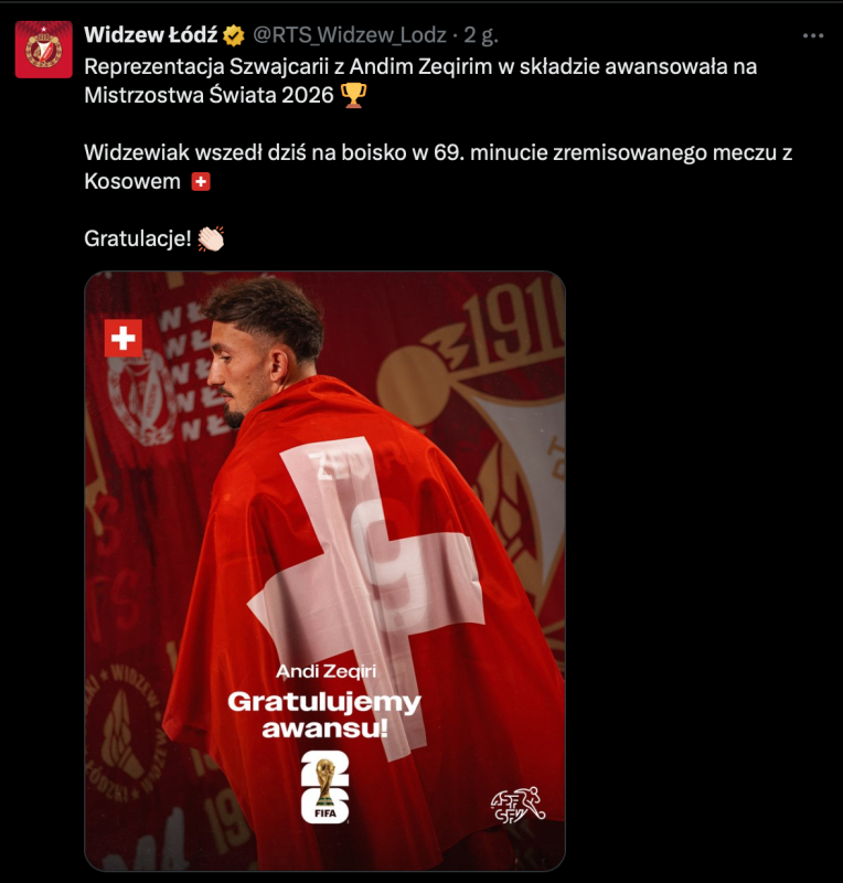 Napastnik czerwono-biało-czerwonych w przyszłym roku pojedzie na mundial! Jego reprezentacja we wtorek przypieczętowała awans na turniej remisując 1:1 z Kosowem. Ten rezultat dał Szwajcarom bezpośrednią promocję. Zeqiri zameldował się na boisku w 69. minucie zmieniającą Breela Embolo. Gola jednak nie zdobył. Z kolei w zespole Kosowa w pełnym wymiarze czasowym wystąpił inny zawodnik Widzewa, Dion Gallapeni, który według serwisu Flashscore został najlepszym zawodnikiem spotkania! Jego reprezentacja weźmie udział w barażach o awans. Podobnie zresztą jak Albania, której reprezentantem jest oczywiście jeden z liderów Widzewa, Julian Shehu.
